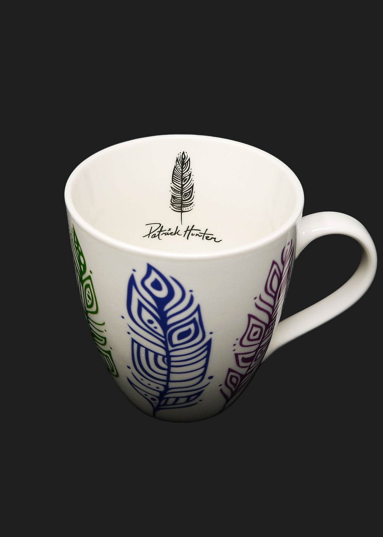 Celebrate Pride with Ojibwe artist Patrick Hunter's striking Pride Feathers mug that combines bold colour with delicate balance and features the artist's signature on the inside.